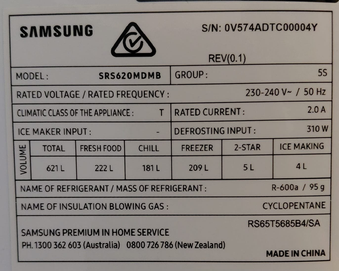 The Samsung SRS620MDMB 621L 3-Door Side-by-Side Refrigerator is a premium fridge designed for large households and modern kitchens. With a 621-litre capacity, this fridge offers ample space for fresh food, drinks, and frozen items, keeping everything neatly organised and easily accessible.