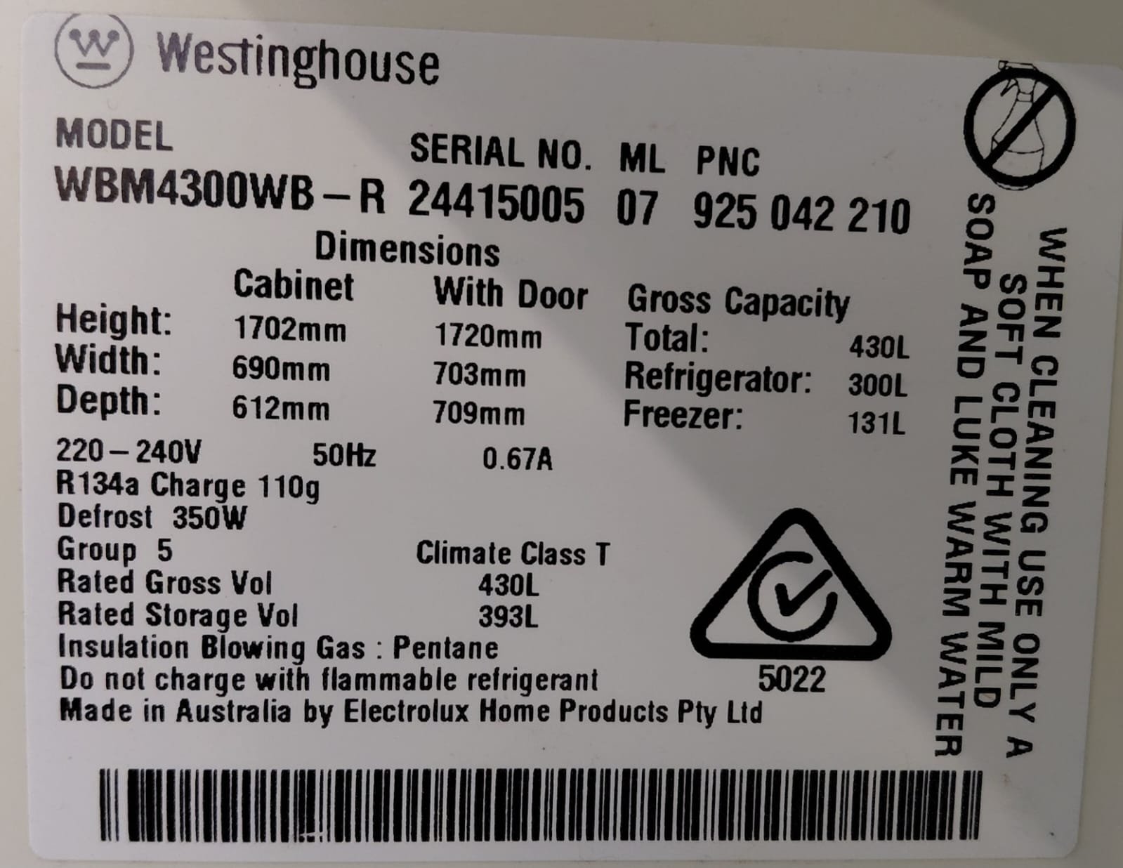 Fridge Capacity: ~300 L